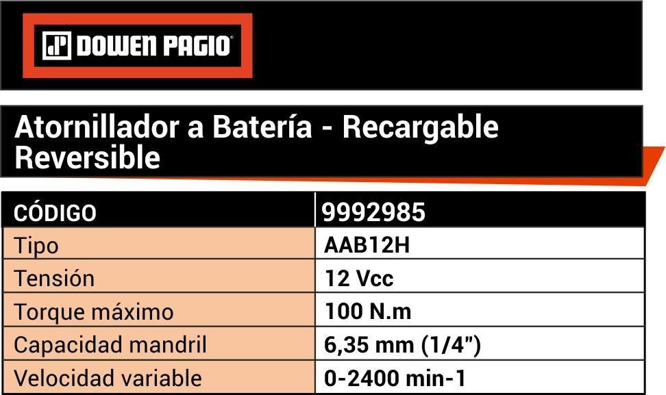 El atornillador inalámbrico 1/4 12V Dowen Pagio AAB12H es la herramienta ideal para profesionales que buscan potencia y versatilidad en sus proyectos. Con un torque máximo de 100 Nm y una velocidad de rotación que alcanza hasta 2400 rpm, este destornillador de impacto se adapta a diversas aplicaciones, garantizando un rendimiento excepcional.