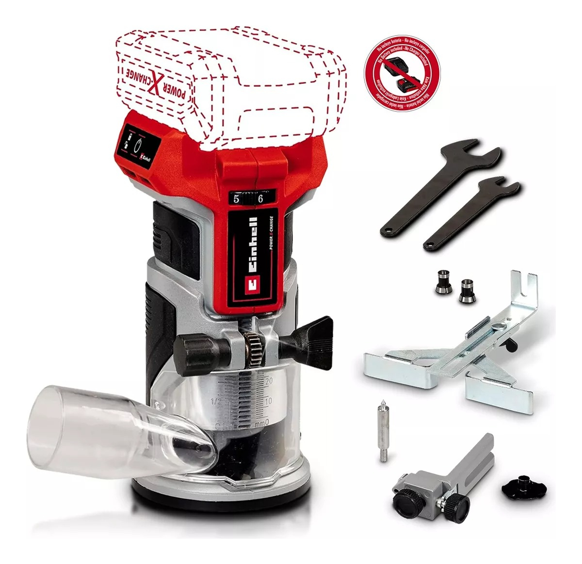PXC 18v. Motor sin escobillas. Control electrónico de velocidad. Ajuste de profundidad de fresado. Pinza de 6 y 8 mm. Iluminación LED. Incluye una barra guía con un rodillo, una punta circular y una herramienta de montaje. Adaptador para conectar aspiradoras. Sin batería ni cargador