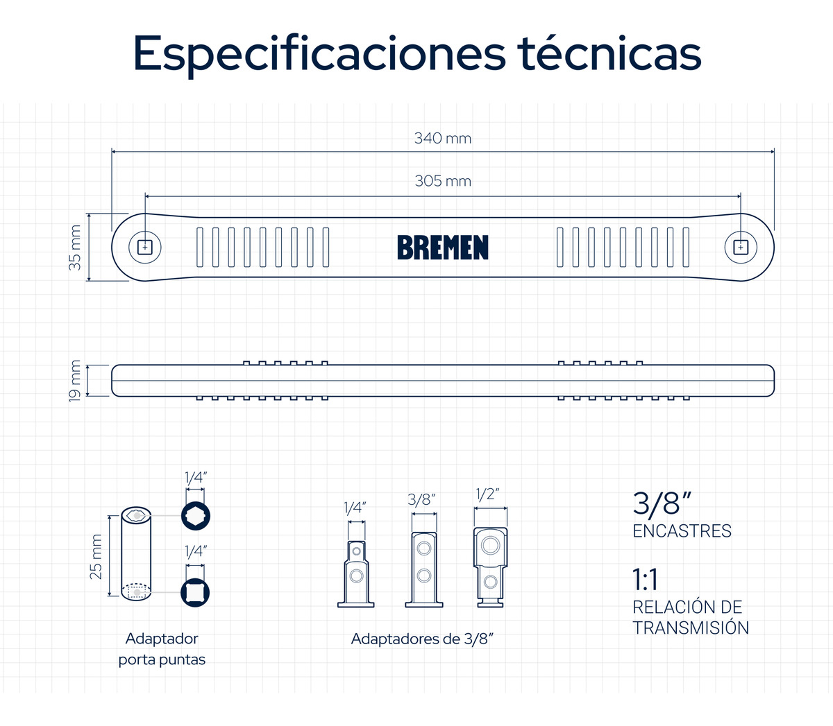 La extensión paralela Bremen Enc 3/8 34cm + 4 adaptadores 8445 es la herramienta ideal para quienes buscan eficiencia y comodidad en sus trabajos de mecánica y mantenimiento. Con un cabezal de 3/8″ y un largo de 34 cm, esta llave permite acceder a espacios reducidos con facilidad, facilitando el trabajo en diversas aplicaciones.