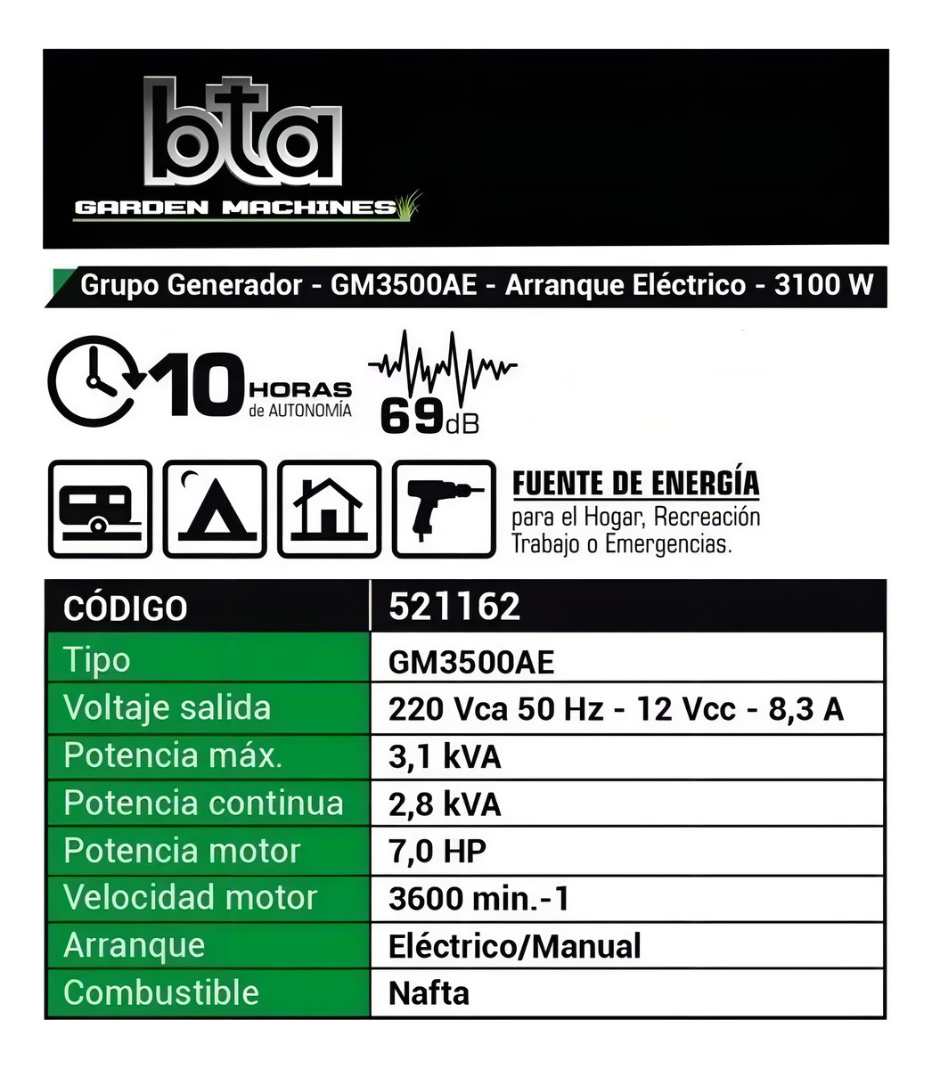 El generador Bta Tools GM3500 es la solución ideal para quienes buscan un suministro eléctrico confiable y eficiente. Con una potencia nominal de 3.1 kW y un sistema de arranque eléctrico, este generador monofásico es perfecto para uso doméstico o en obras. Su tecnología AVR garantiza una salida de voltaje estable, protegiendo tus dispositivos electrónicos.