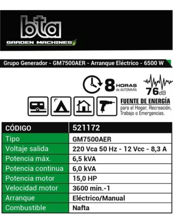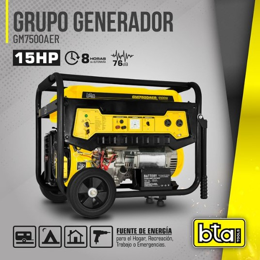 El Generador Luz Grupo 6500w 15hp 4t Arr Eléctrico C/ Ruedas de Bta Tools es la solución ideal para quienes buscan potencia y versatilidad en un solo equipo. Con una potencia máxima de 6.5 kW y una potencia nominal de 6 kW, este generador es perfecto para abastecer tus necesidades eléctricas en situaciones de emergencia o en actividades al aire libre.