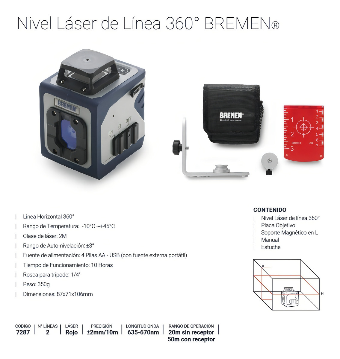 Optimiza tu flujo de trabajo con este nivel láser, que combina tecnología avanzada y facilidad de uso. Ya sea que estés planificando una reforma o realizando pequeñas mejoras en casa, el Bremen 7287 te brinda la confianza y el respaldo que necesitas para llevar a cabo tus tareas con éxito.