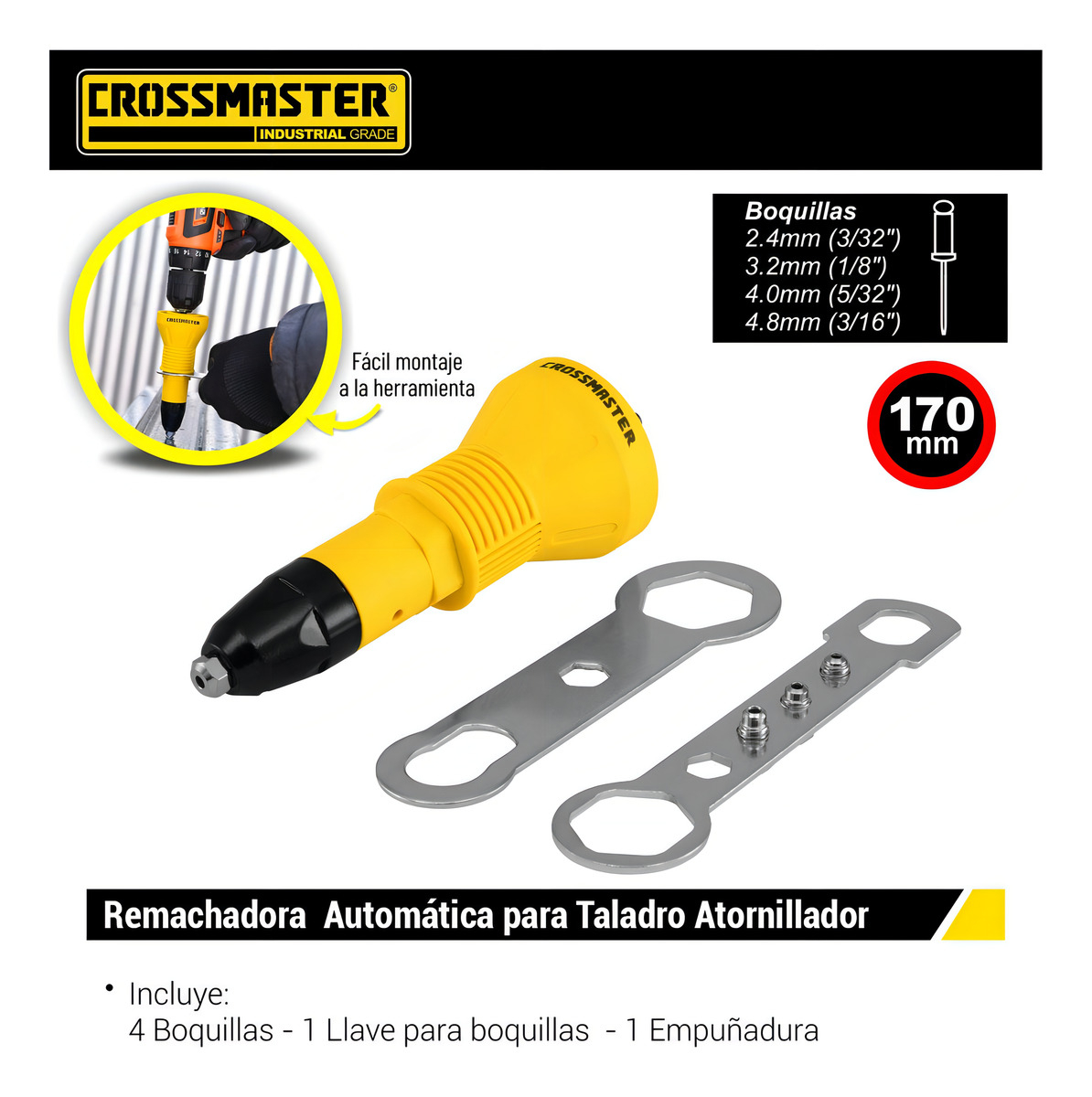 La Remachadora Para Taladro Crossmaster 9971050 es la herramienta ideal para quienes buscan eficiencia y precisión en sus proyectos de ensamblaje. Con un diseño automático, esta remachadora facilita el trabajo, permitiendo realizar uniones de manera rápida y efectiva. Su construcción en acero templado garantiza durabilidad y resistencia, asegurando un rendimiento óptimo en diversas aplicaciones.