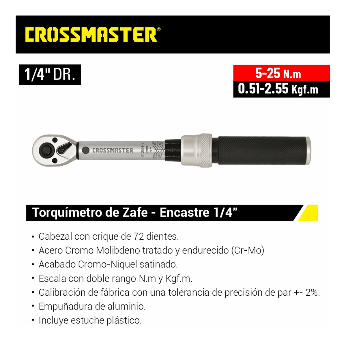 El Torquímetro De Zafe Encastre 1/4 5/25Nm Crossmaster 9936105 es una herramienta esencial para quienes buscan precisión y confiabilidad en sus trabajos de mecánica y ensamblaje. Con un rango de torque de 25 Nm y un diseño bidireccional, este torquímetro permite un ajuste fácil y seguro, garantizando que cada tornillo esté apretado con la fuerza adecuada.